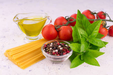 Products ingredients for italian pasta on a white background.