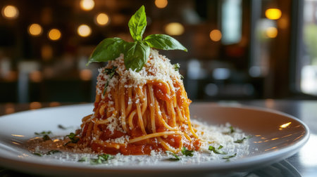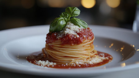 A beautifully plated classic spaghetti dish topped with rich tomato sauce, fresh basil, and grated cheese, perfect for any Italian meal.