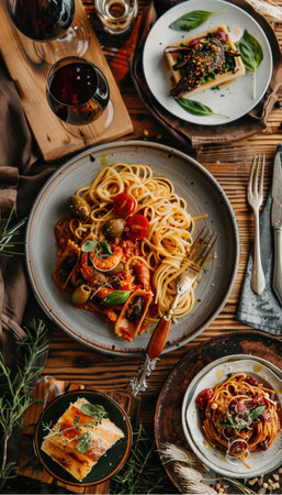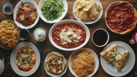 Experience a delightful aerial view showcasing an exquisite spread of Italian dishes. The colorful presentation invites sharing and savoring together.