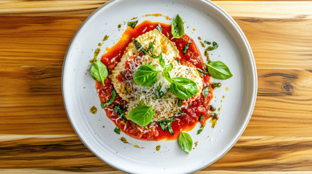 Indulge in a beautifully plated ravioli topped with rich tomato sauce and fresh basil. This gourmet dish showcases vibrant colors and exquisite flavors, perfect for any dining occasion.