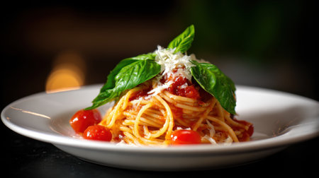 A tempting serving of spaghetti pasta topped with rich tomato sauce, fresh basil, and vibrant cherry tomatoes, ideal for showcasing Italian culinary delights in food photography.