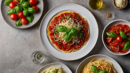 Vibrant tomatoes, fresh basil, and various pasta types are beautifully arranged alongside delectable pasta dishes, showing the art of Italian cuisine and the joy of cooking with fresh ingredients