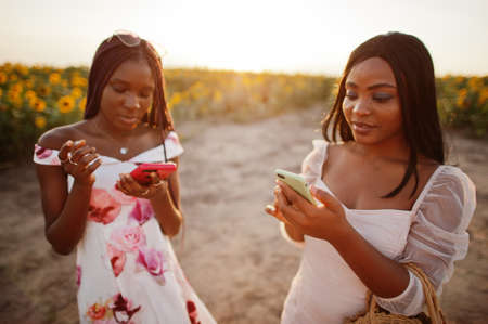 Two pretty young black friends woman wear summer dress pose in a sunflower field texting on phone.