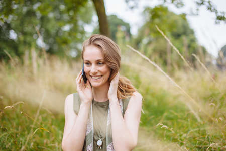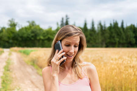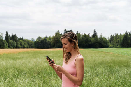 Young brunette looking at her mobile phone while on a walk through beautiful summer nature.