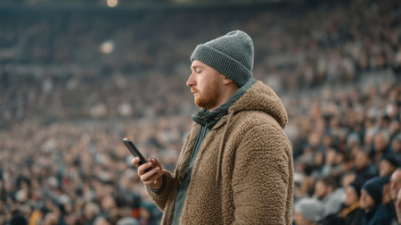 A young man dressed in a cozy jacket and beanie stands in a bustling stadium, using his smartphone to connect with friends amid a vibrant sports event atmosphere.