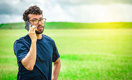 Blur soft-focus smiling Asian young man listening to the podcast is a music audio mp3 player on smartphone outdoors nature sunset background.