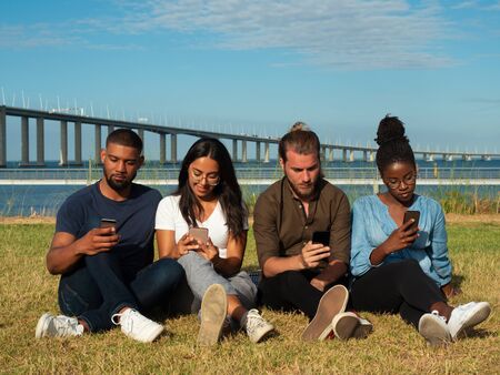 Focused young men and women sitting in line on grass and using smart phones. Diverse team of friends obsessed with gadgets. Social media addiction concept