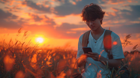 Teenage Boy Using Phone In Urban Setting, Sitting on Grass at sunset