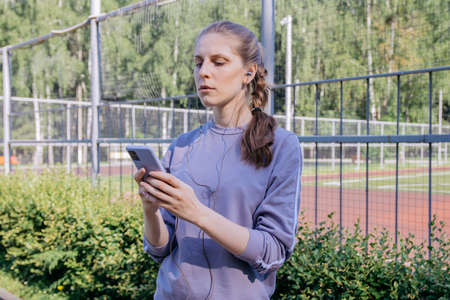 A girl in a sports uniform on the workout site in headphones prints a message on the phone