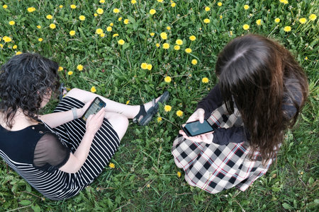 Close-up of two girls using and chatting with their smartphones ar the park.