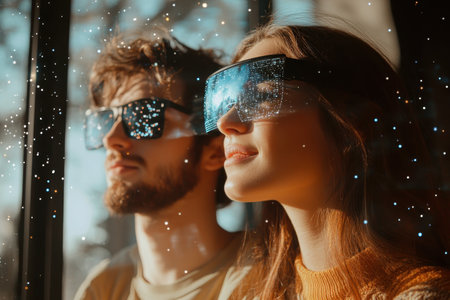 Two people gaze out a window wearing unusual sunglasses reflecting a starry sky while indoors.