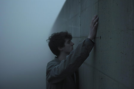 The setting showcases a contemporary wall with smooth gray and blue panels reflecting light softly. This architecture emphasizes simplicity and elegance in urban design.