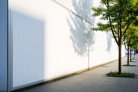 A vibrant tree with lush green leaves grows beside a smooth white wall and a gray concrete foundation creating a tranquil modern atmosphere. The setting captures simplicity and nature.