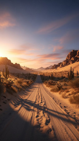 AI Generated. Serene Desert Landscape at Sunset with a Long Gravel Road Leading to the Horizon