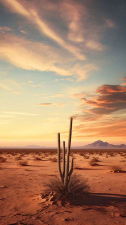Desert showing minimalist desert landscape with soft sand dunes and a single saguaro cactus at sunrise. resolution use.