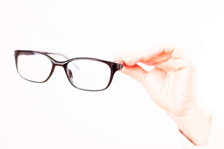glasses in womens hands close-up, white background