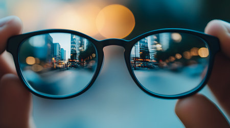 Captivating image of hands holding glasses that beautifully reflect a vibrant cityscape at sunset, showcasing the interplay of light and colors.