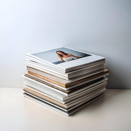 A stack of magazines with a photo of a woman on the top. The image evokes a sense of nostalgia and memories captured in printed form. Perfect for design projects related to photography. nostalgia. or storytelling.
