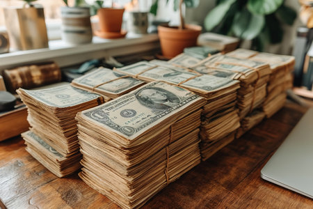 a pile of dollar bills, stacked neatly on a table