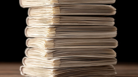 A neatly arranged stack of blank notebooks sits on a dark wooden surface, showcasing textured pages. The soft lighting highlights the craftsmanship and minimalist appeal of these stationery items.
