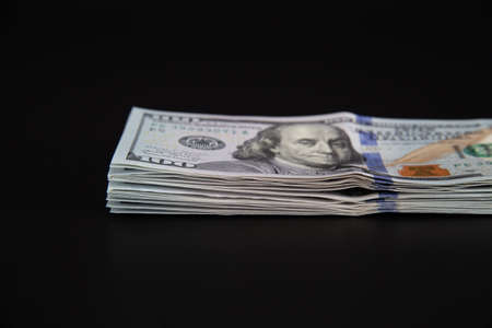 Big pile of one hundred dollar bills on a black background. Business and credit.