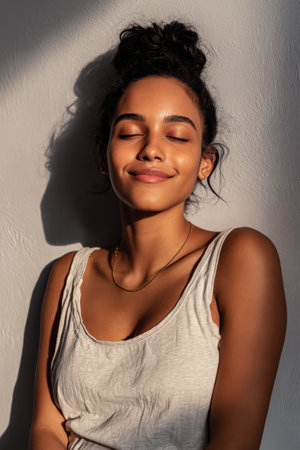 A young woman with curly hair smiles softly as sunlight bathes her face. She appears relaxed sitting against a wall in a warm and inviting room radiating calm and happiness.