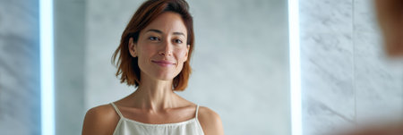 Beautiful woman with short hair smiling while looking at her reflection in a modern bathroom mirror with bright led lights, enjoying a moment of self care and confidence
