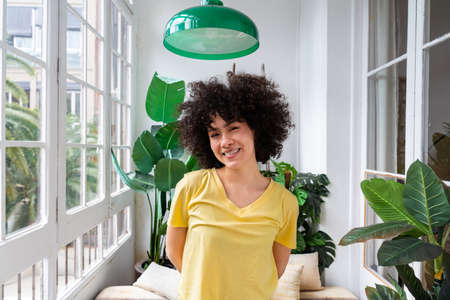 Beautiful latino young woman at home - Pretty south american with curly hair female portrait, lifestyle and domestic life scene