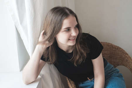Young beautiful woman in a black T-shirt sits in chair by the window with pensive look. She thinks about something and smiles.