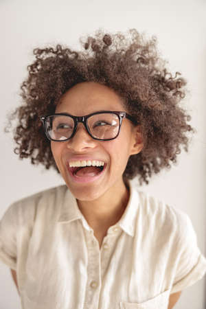 Pretty multiethnic lady laughing cheerfully in the studio