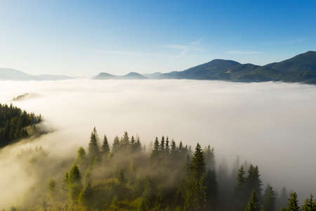 Foggy morning in the mountains with coniferous forest.