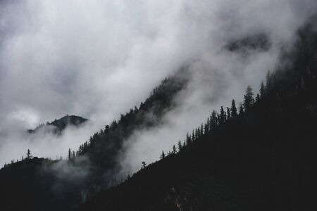 Scenic landscape view of the forested mountain slope in clouds with the evergreen conifers in mist