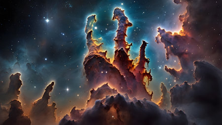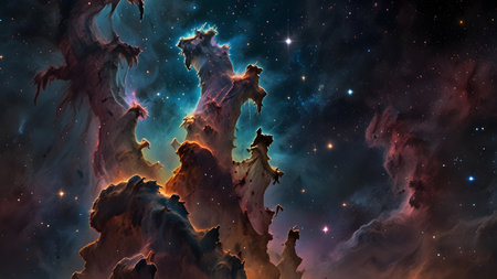 A vibrant nebula displays towering cosmic pillars of gas and dust illuminated by brilliant starlight in deep space.