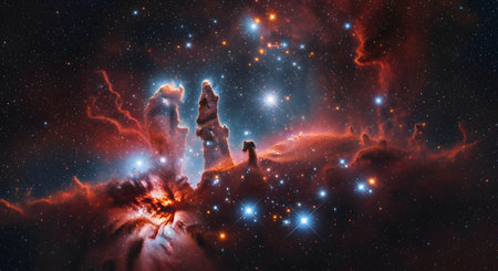 Celestial Firestorm Fiery Nebula in Deep Space, Vibrant Cosmic Clouds and Shimmering Stars