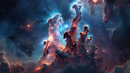 A vibrant nebula displays towering cosmic pillars of gas and dust illuminated by brilliant starlight in deep space.