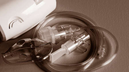 Medical equipment for inhalation with respiratory mask, nebulizer on the wooden table