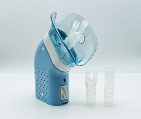 Portable inhaler wtih mouth tube isolated on white studio background. Medical neubulizer device