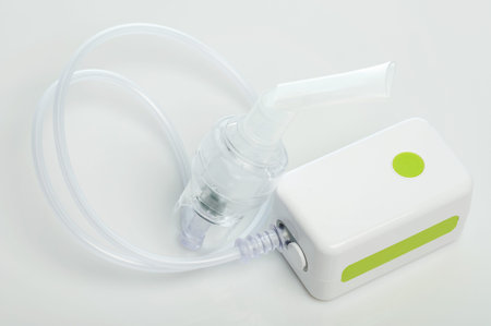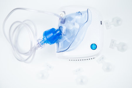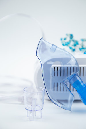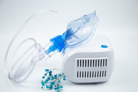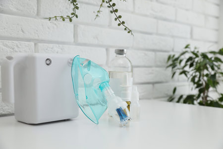 Portable compressor nebulizer on white table. Medical equipment for inhalation therapy, asthma, bronchitis.