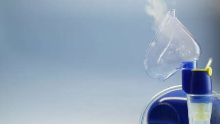 Nebulizer. Medical equipment for inhalation with a respiratory mask on a blue background. Respiratory medicine. Respiratory treatment of asthma, bronchitis in home conditions, copy space.