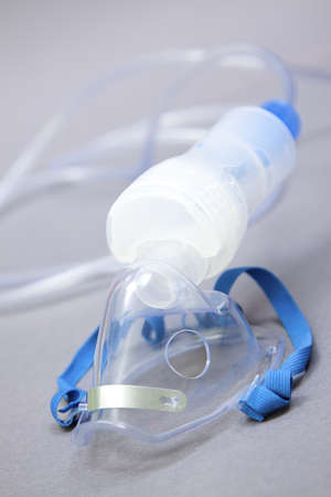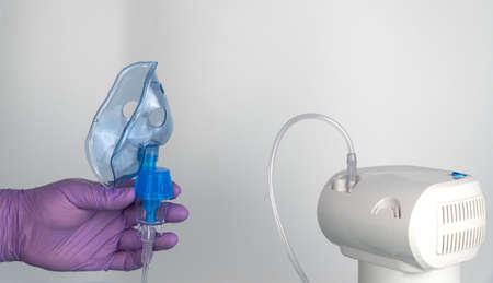 Oxygen mask of nebulizer, medical equipment for pneumonia, covid, sars and bronchitis treatment. Inhaler, respiratory pulmonary disease recovery. Flu, cough and bronchial asthma therapy.