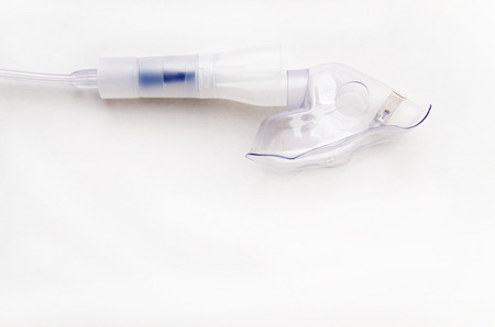 tube mask nebulizer and tubular transparent cable, saline on a white background, inhalation.