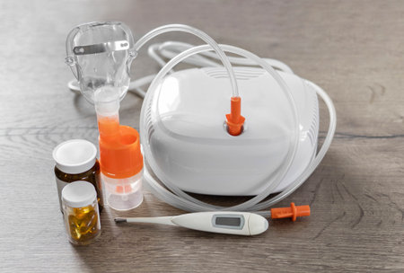 Close-up of a medical nebulizer with inhalation mask, digital thermometer, and medicine bottles on a wooden table. Concept of respiratory therapy, healthcare at home, and asthma treatment.