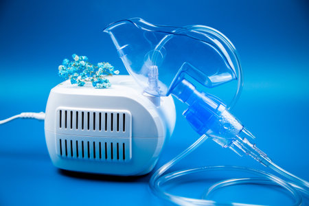 The blue breathing mask of the inhaler, from which steam is emitted, lies on the device on a blue background. The concept of treatment of respiratory tract diseases, lung diseases, medicines. High quality photo