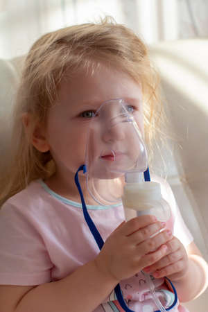 Little girl having inhalation for easing cough. Caucasian blonde girl inhales couples containing medication to stop coughing.