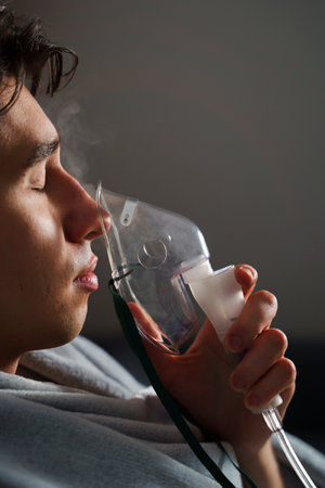 Man inhaling through oxygen mask for cough treatment. Using compressor nebulizer for disease treatment at home