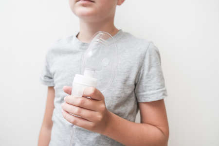 Unrecognizable boy holding an oxigen face mask in hand, pneumonia and lung desease prevention, drug inhalation to lungs, copy space