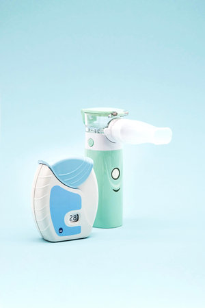 The breathing blue mask of the inhaler lies on the device and next to the flowers on a white background. The concept of treating respiratory diseases, lung diseases, prevention and self-care. High quality photo
