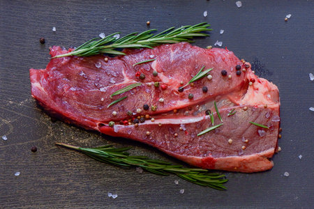 Raw organic beef meat with rosemary, seasonings, salt and red pepper on black background, close-up. Preparing to cook steak