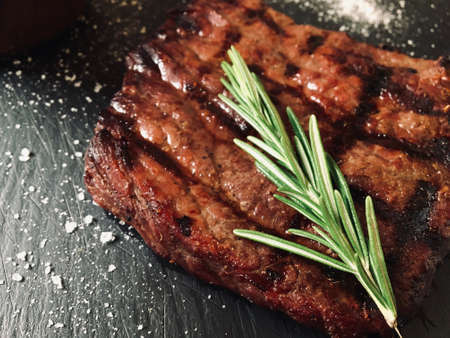 Grilled beef steak cooked on barbecue, closeup on dark wooden table background. Fresh juicy roasted red meat on black stone board, pepper and rosemary. Restaurant food, delicious dish, selective focus