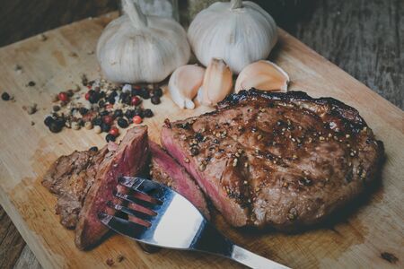 Medium pepper steak slice cut on wooden plate with spices seasoning in grey and dark tone lighting.